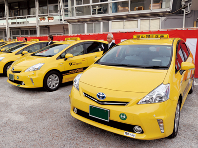 2月5日、快晴の岡山市北区錦町。ここ両備ホールディングス(株)本社前に並びしは、鮮やかなイエローがまぶしい五台のプリウスα。納車先は現在、保有台数約600を誇る西日本屈指の交通関連企業、両備グループ・タクシー3社様。「2011年の登場以来、環境に優しいプリウスαには、大変興味がありました。今回、LPGとのハイブリッドによるバイフューエルシステムになったことで、燃費もさらに向上、環境面でも圧倒的に優れたワゴンタイプの小型タクシーとして、計5台を岡山市内に登場させることができました」と満面の笑みで語るのは両備グループ代表・CEOの小嶋光信さま。とはいえ本来、中型適用のプリウスαを小型タクシーにアレンジするのは容易なことではなかったはず。 「特販部の国定さんに『小型にしてほしい』とリクエストしたんです。彼なら何とかしれくれるはずだと…(笑)」と語るのはタクシーグループグループ長の土江様。 担当の国定いわく…「小型タクシーの規格にするには、全長を4600ミリ以内にする必要がありました。ただプリウスαは4615ミリあります。そこで悩んだ末に出した結論が…後部バンパーを新しく製作して全長を短くすることをご提案することでした。結果はご覧の通り。25ミリの短縮に成功しました」。 「従来車に比べ、燃費は約3倍向上、加えて足元が3センチ広がり、大変乗りやすくなりました。その他にも車内にはウィルスを除去するウィルスウォッシャー、スマートフォン用充電器も完備、お客様と乗務員の安全と健康を守るよう配慮しています」と松田専務。 最後に松田久両備グループ代表・CEOO…「タクシー業はサービス業です。そのためにはお客様に選ばれなくてはならない。安全・安心・エコで健康。これからもサービスの日本一をめざします」。両備カラーのイエローが青空に映える。晴れやかなスタートセレモニーでした。